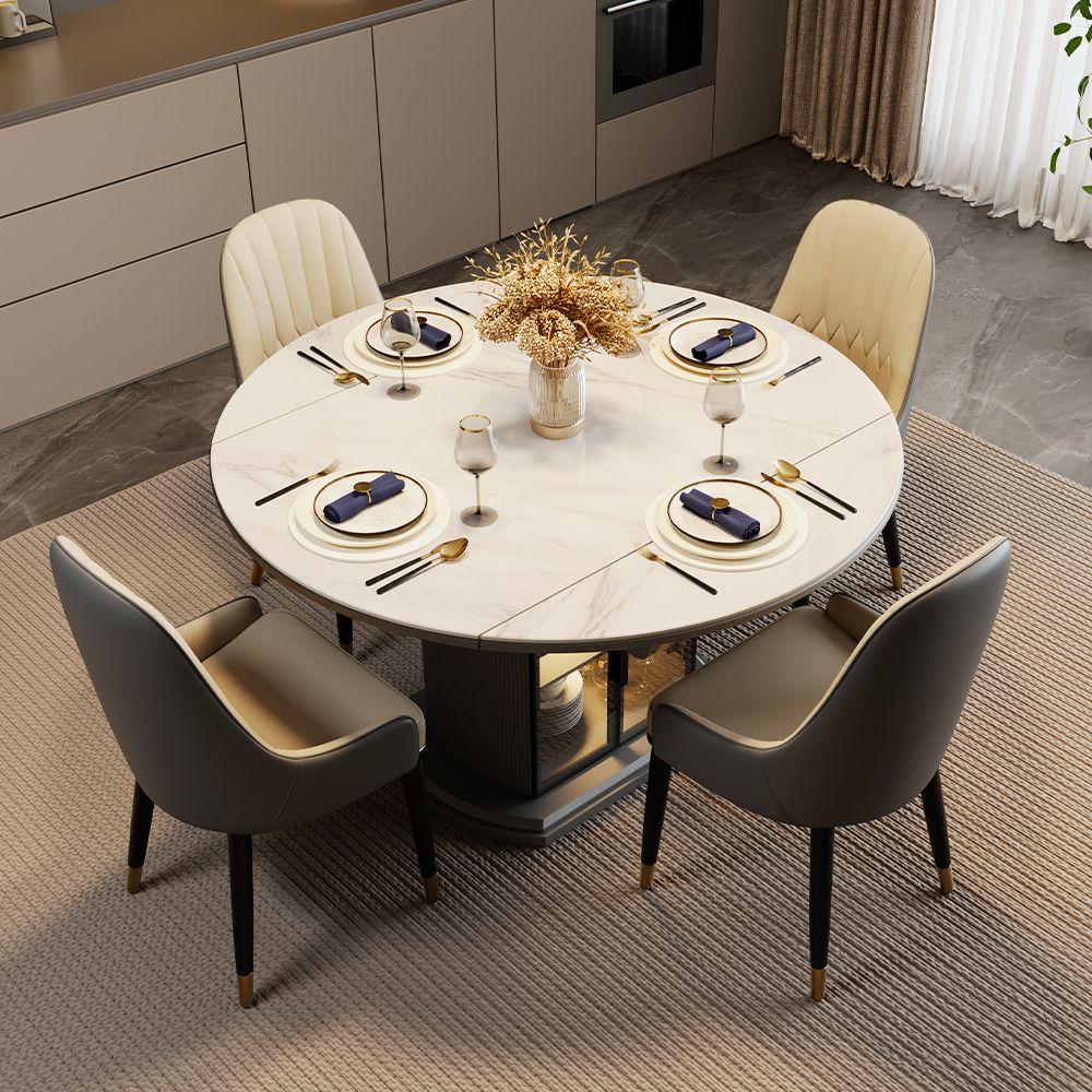 119 Modern Extendable Round Dining Table for 4, Glossy White Sintered Stone Tabletop, Solid Wood Base with Glass Door, Dining Table with Storage