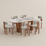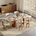 Just received this dining table set from Povison, and I'm blown away! The white quartz tabletop is super durable and a breeze to clean—no worries about spills or scratches. The wooden base gives it a rustic yet modern vibe that fits right into my space. The oval shape is perfect for my medium-sized dining area; it doesn't feel cramped and seats six comfortably with those cozy beige-cushioned chairs. Setting it up was straightforward, though the instructions could be clearer (had to watch a YouTube video, lol). But once assembled, it looked exactly like the product photos—elegant and inviting. I added a vase with some greens and a candle tray, and now it's the heart of my home for meals and gatherings. The price was totally reasonable for the quality; feels like it'll last for years. If you're on the fence, go for it—you won't regret it!