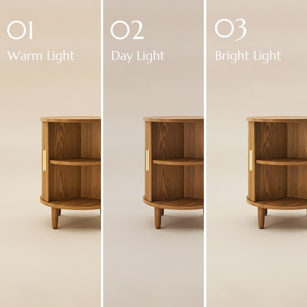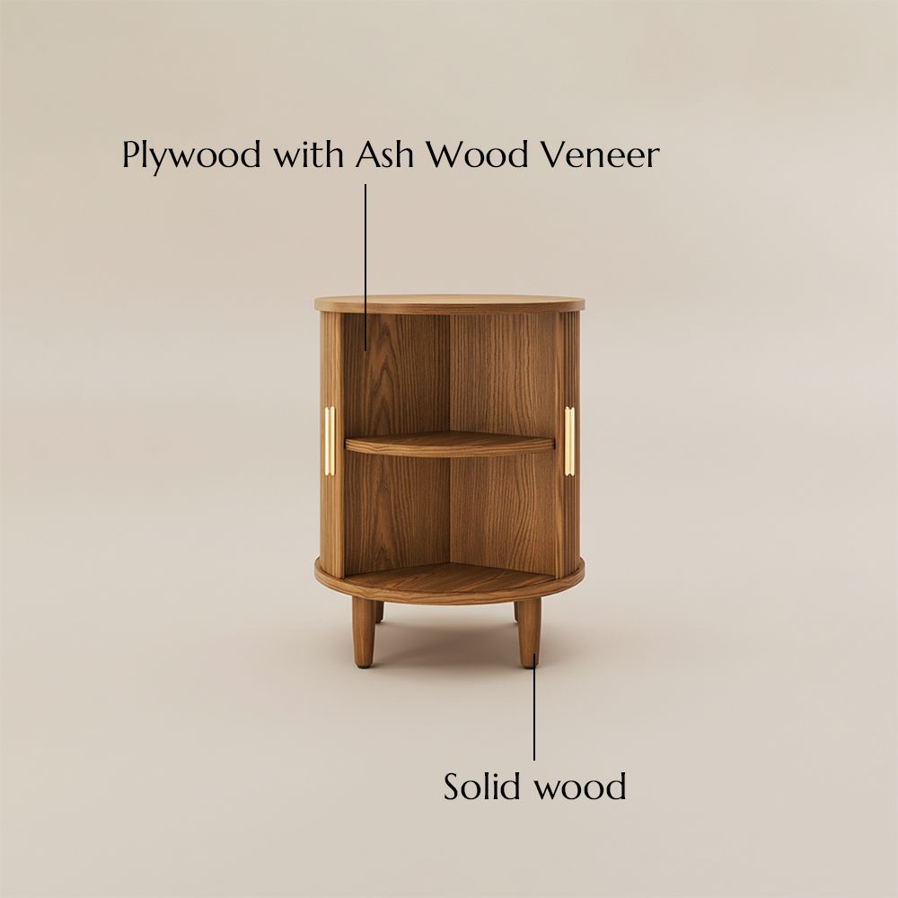 Eos - Modern Mid-Century Round Walnut Color Side Table with Sliding Tambour Door & Storage Shelf